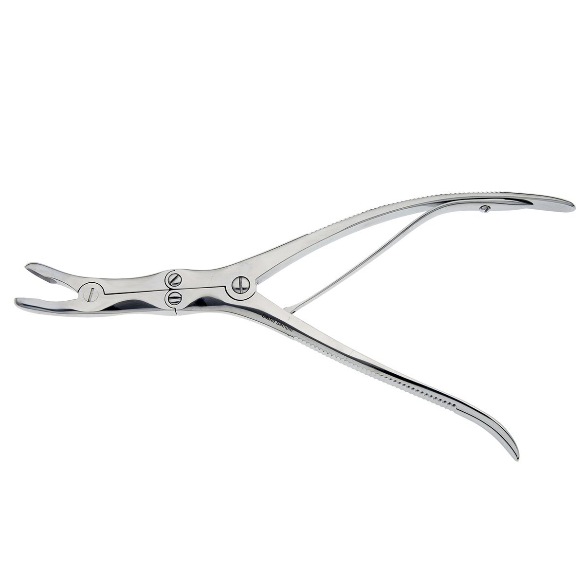 Bone rongeur with original Curemed double-action joint and sideways slightly curved wide jaws.