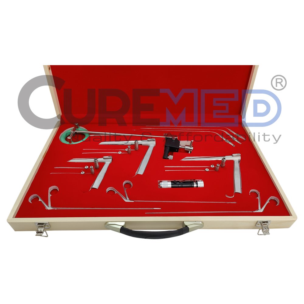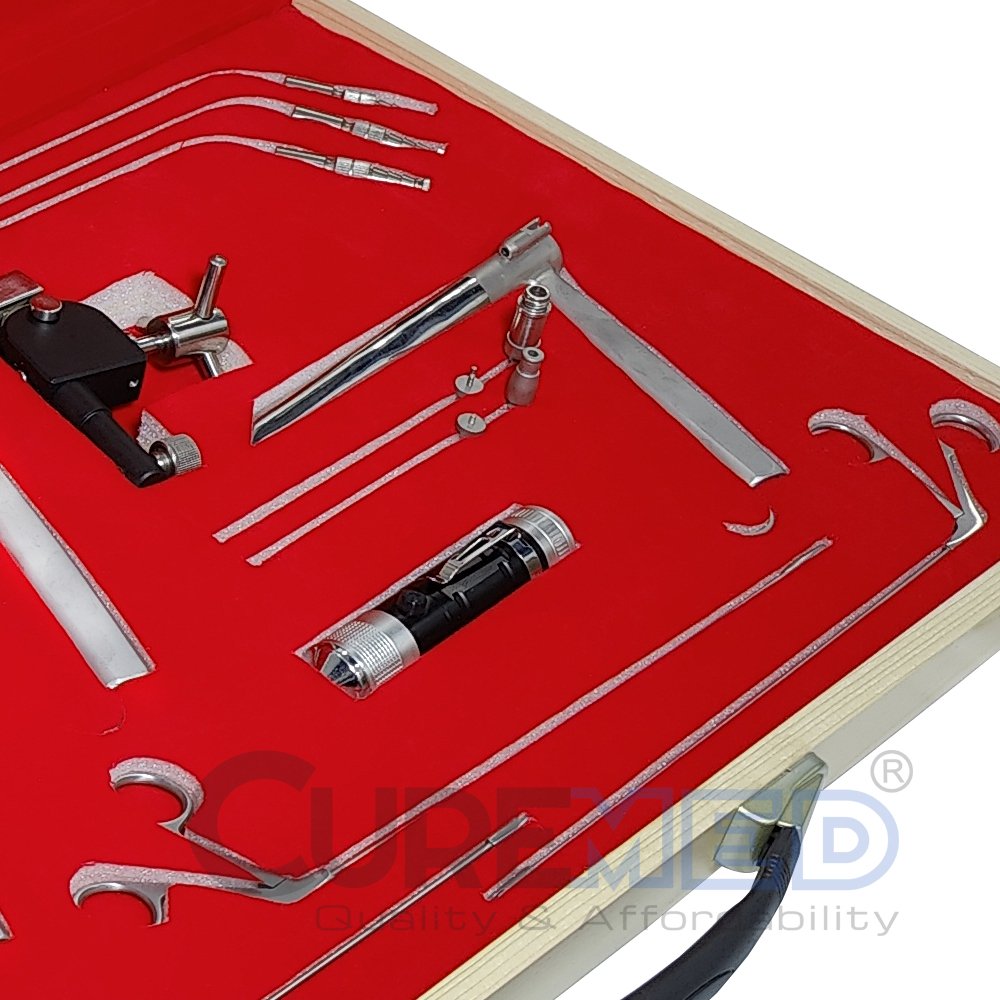 The Curemed Micro Laryngeal Instruments Pedestal Laryngoscope Set Is An Exceptional Quality Surgical Instrument Kit Specifically Designed For Endoscopic Sinus Surgery And Micro Laryngeal Procedures. This Complete Set Includes All The Necessary Micro Laryngeal Forceps, Scissors, And Laryngoscopes Required To Perform These Surgeries.