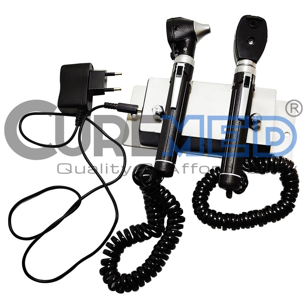 - The Wall Mount Otoscope + Ophthalmoscope Set is a comprehensive diagnostic tool designed for medical professionals, particularly ear, nose, and throat (ENT) specialists, and ophthalmologists. This set includes a wall-mounted unit that conveniently holds both an otoscope and an ophthalmoscope, providing easy access and efficient organization in clinical settings. The otoscope is used for examining the ear canal and eardrum, while the ophthalmoscope allows for detailed examination of the eyes, including the retina and optic nerve.