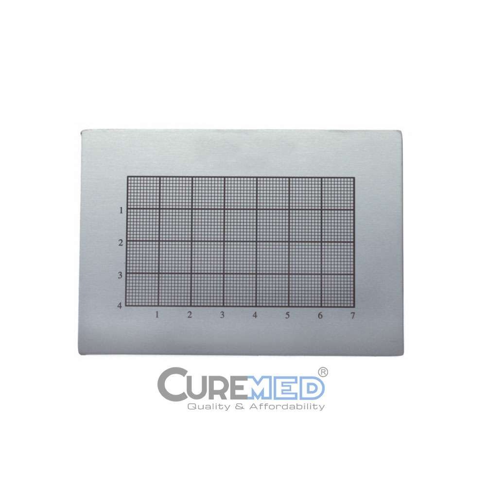 Aluminum. For cutting, measuring, and photographing cartilage grafts. Measured in millimeters. Can be used as a cutting surface.